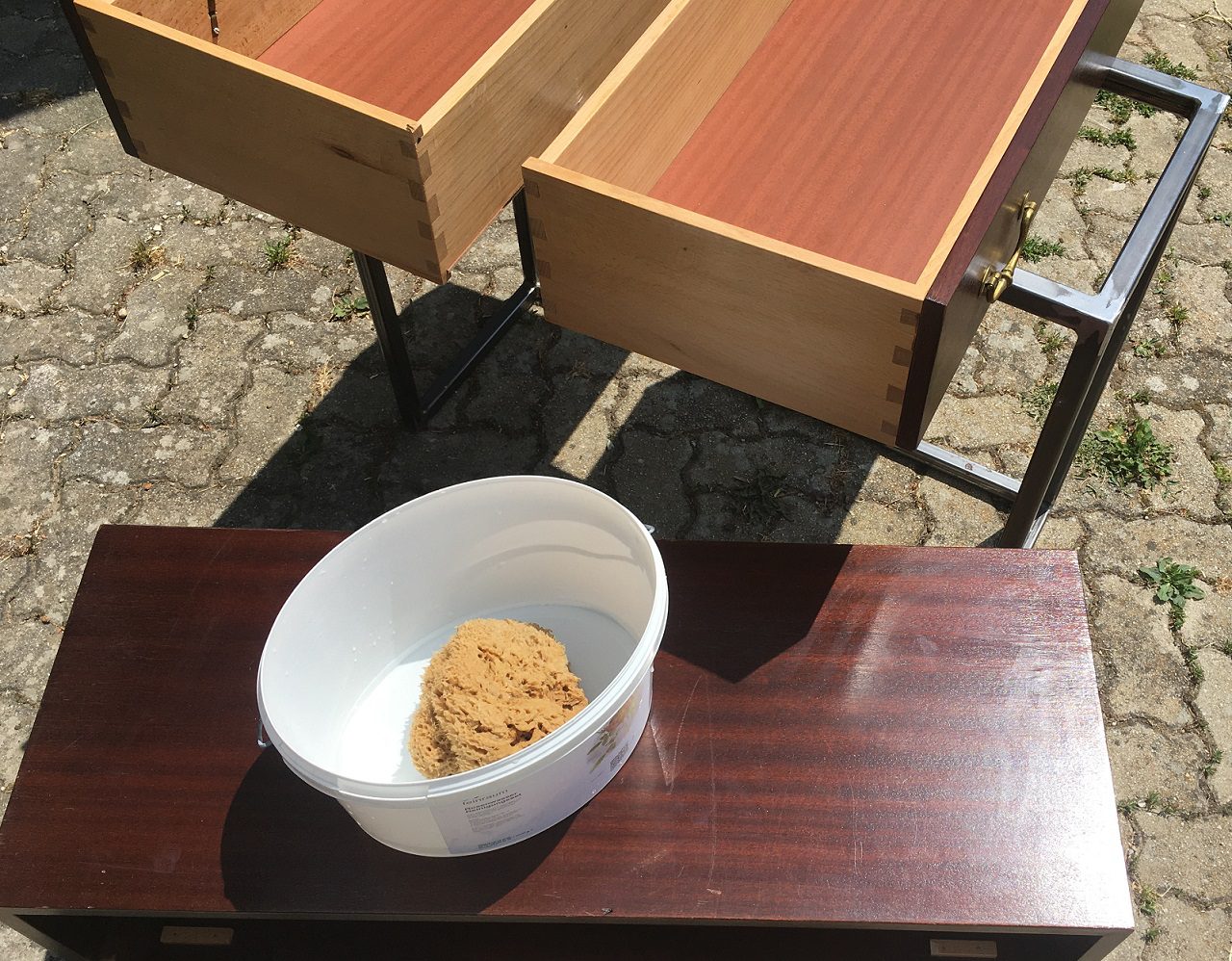 Doch bevor ich den Pinsel schwinge, beginnt für mich die wichtigste Arbeit, die Grundreinigung. Zuerst starte ich mit dem Kompressor die Trockenreinigung, darauf folgt die Nassreinigung. In manchen Härtefällen auch mal mit dem Schlauch. ;-) Nur bei Massivholzmöbeln, versteht sich. Wenn der sichtbare Schmutz beseitigt ist, gehts an die „feinstoffliche“ Reinigung. Viele der guten Stücke haben doch schon einige Jahre hinter sich und somit auch ihre ganz persönlichen Geschichten – nicht alle sind Liebesgeschichten…